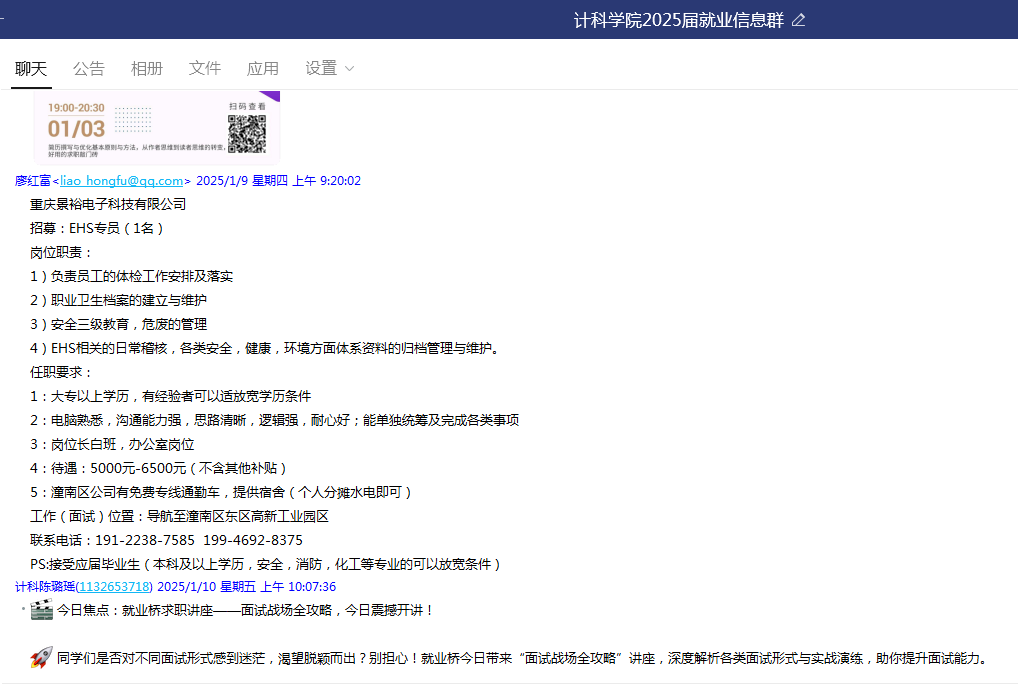 寒假期间,计科学院充分利用班级QQ群等平台,安排专人负责,收集、筛选、发布各类招聘信息,并针对不同专业、不同就业意向的学生进行精准推送,确保信息传递及时、有效。涵盖互联网、软件开发等多个领域,为学生提供了丰富的就业选择。