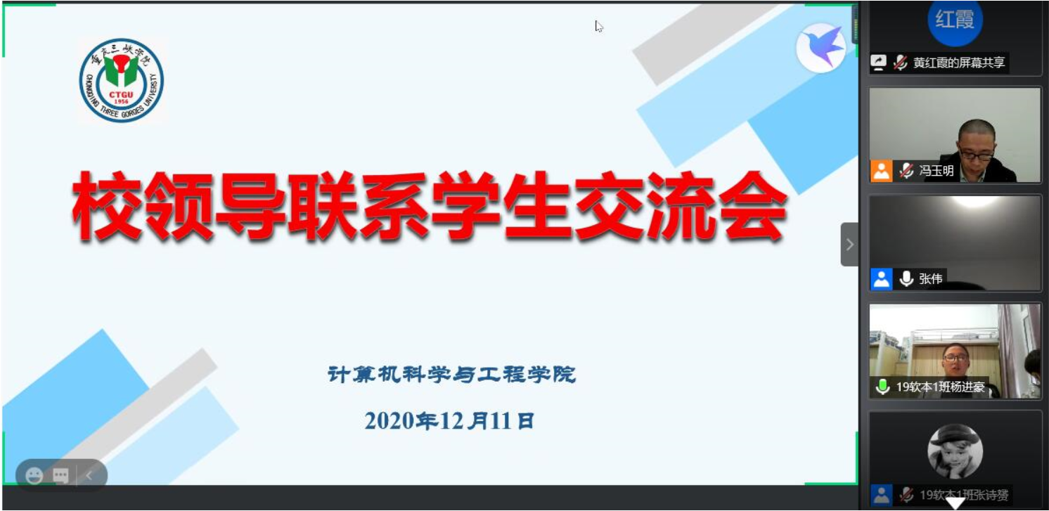 12月11日16时,张校长与计科学院联系的班级、社团、宿舍、学生党支部学生代表通过腾讯会议线上交流。会议由计科学院副院长冯玉明主持。