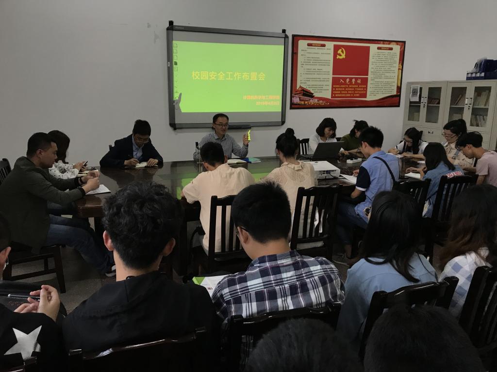 4月8日18点,计科学院在慎思楼三栋403会议室召开校园安全工作布置会,全院各班班长、团总支学生会主要学生干部、全体辅导员参加会议,会议由党总支副书记刘文菘主持。