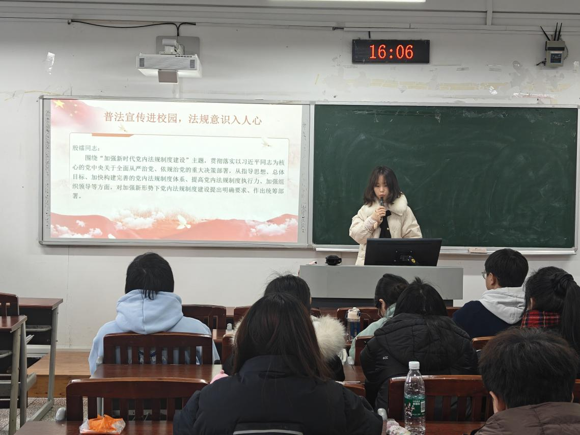 殷镭以“加强新时代党内法规制度建设”为主题,要求学生党员深刻认识到党内法规制度建设的重要性,多主动学习、主动遵守党的各项法规制度,不断提高自身的法治素养和制度执行力。在日常学习和生活中,自觉遵守党的纪律规矩,坚决维护党内法规制度的严肃性和权威性,积极发挥先锋模范作用,带动周围同学形成共同学习遵守党内法规制度的良好习惯,助力营造风清气正的校园氛围。