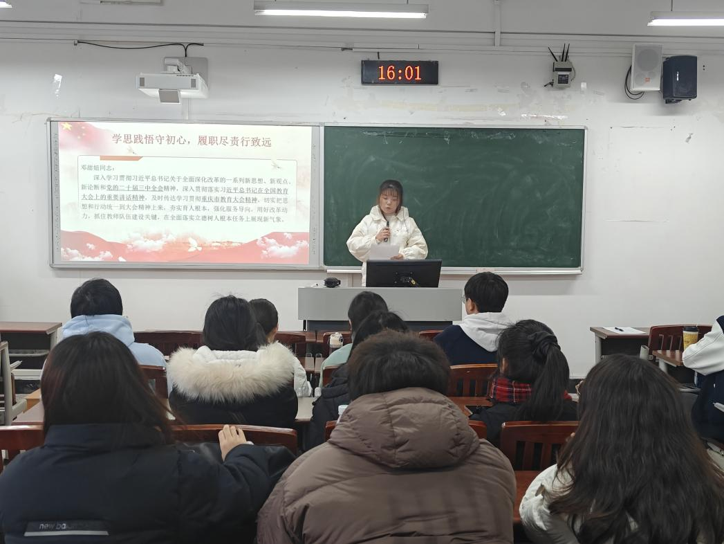 党支部组织委员邓甜妞围绕习近平总书记关于全面深化改革的一系列新思想、新观点、新论断,党的二十届三中全会精神、全国教育大会精神和全市教育大会精神等内容作领学。党支部宣传委员王珑菲围绕“清风正气铸清廉,奋勇争先作表率”为主题作宣讲,号召全体党员同志进一步筑牢思想道德防线,增强廉洁自律意识,坚守服务初心,加强党性修养。