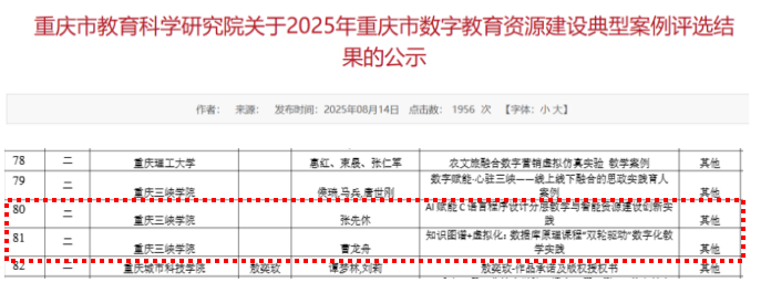 近日,重庆市教育科学研究院公布了2025年重庆市数字教育资源建设典型案例评选结果。今年会张先休老师申报的作品《AI赋能C语言程序设计分层教学与智能资源建设创新实践》和曹龙舟老师申报的作品《知识图谱+虚拟化:数据库原理课程“双轮驱动”数字化教学实践》荣获高等教育学段二等奖。